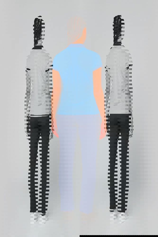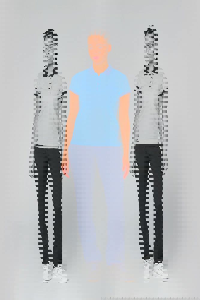 100% piquépolyester Cool Plus®. Getailleerde snit en moderne look. Kraag en mouwuiteinden in contrasterende ribboord. Knoopsluiting met 4 knopen (contrasterend of effen, afhankelijk van het model). Zijsplitten.