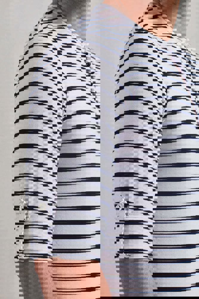 82% polyester / 14% viscose / 4% elasthan. Met kleurgeweven strepen White / Navy. Een eenvoudige maar polyvalente stijl die met zowel lange als opgestroopte mouwen kan worden gedragen. Dankzij de zachte en soepele stof is dit een meer casual en trendy alternatief voor het klassieke overhemd. Opstroopbare mouwen met een knooplijst vooraan de arm. Ronde halsopening met knooplijst met 3 knopen. Ribboord aan de halsopening en de mouwuiteinden. Zachte en soepele stof.