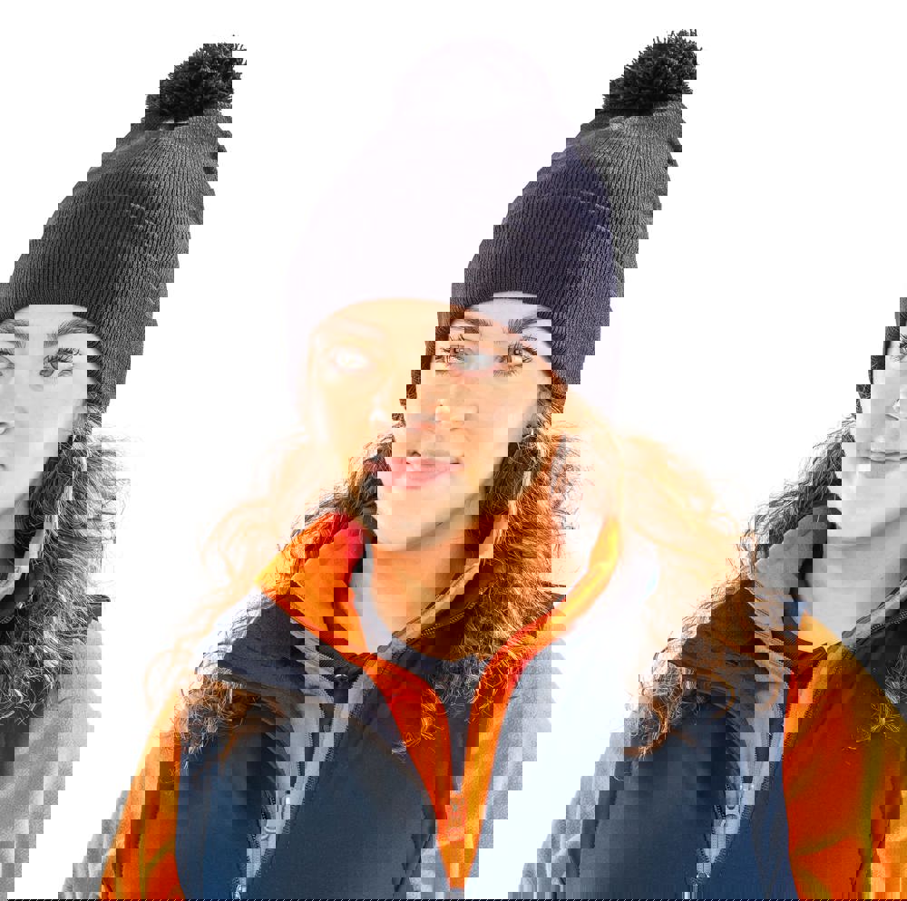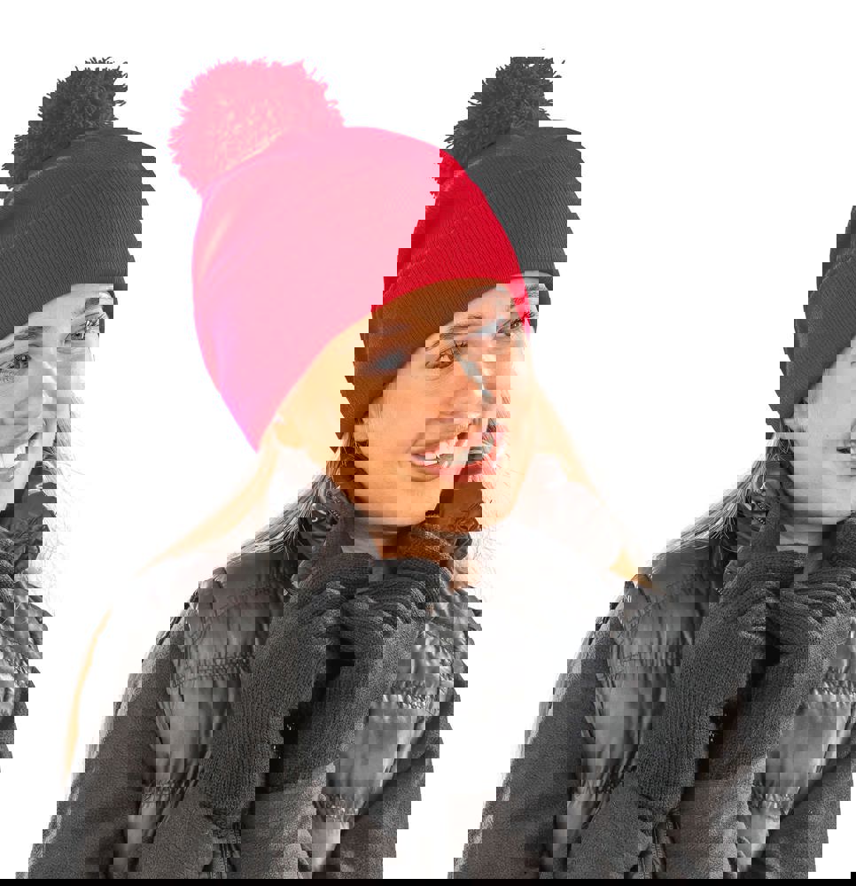 100% zacht polyacryl. Dik breiwerk, dubbele dikte, bedekkend, omgevouwen boord, pompon als versiering. Wasbaar op 40 °C. Klaar voor gepersonaliseerde bedrukking.
