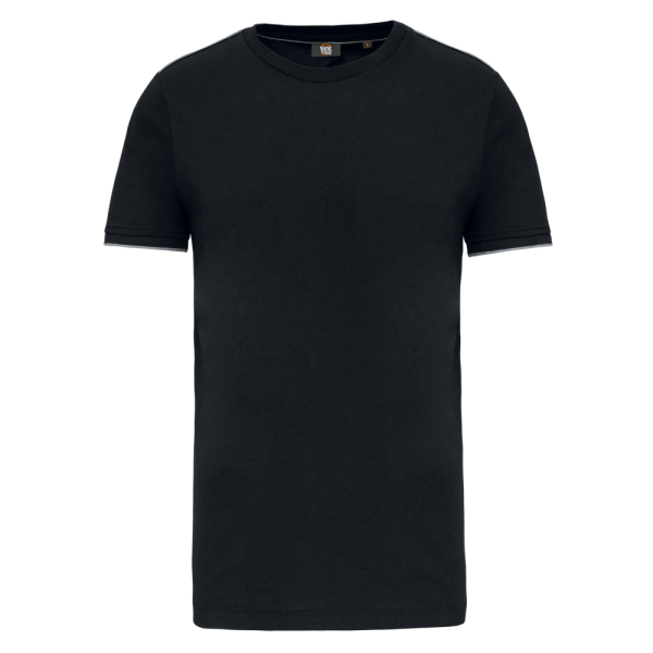 65% polyester / 35% katoen. Gekamd katoen jerseystof. Wasbaar op 60 °C. Anti-pluisbehandeling. Ronde hals met elasthan. Contrasterende bies aan binnenkant kraag en schouders. Mouwuiteinden in ribboord met contrasterend biesje. Afwerking met dubbel stiksel onderaan. Ideaal voor dagelijks gebruik.