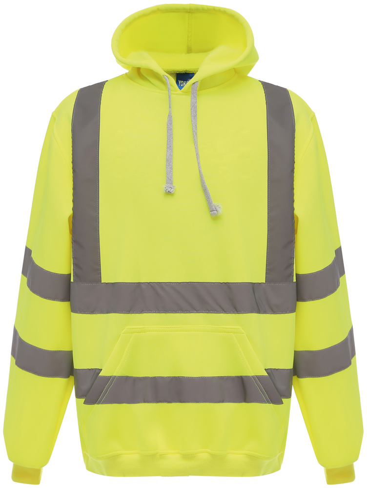 100% niet-pluizend polyester. 2 reflecterende stroken (5 cm breed) rond het lichaam en op de armen. Een reflecterende band op iedere schouder. Nektape. Capuchon (in het verlengde van de kraag) met aanrijgkoordje. Ingezette mouwen. Kangoeroezak aan de voorkant. Uiteinden van mouwen en kledingstuk in ribboord. Dubbel stiksel aan kraag, uiteinden van mouwen en kledingstuk. Norm EN ISO 20471 van klasse 3 : Hi-Vis Yellow, Hi-Vis Orange, Hi-Vis yellow/Navy, Hi-Vis Orange/Navy.