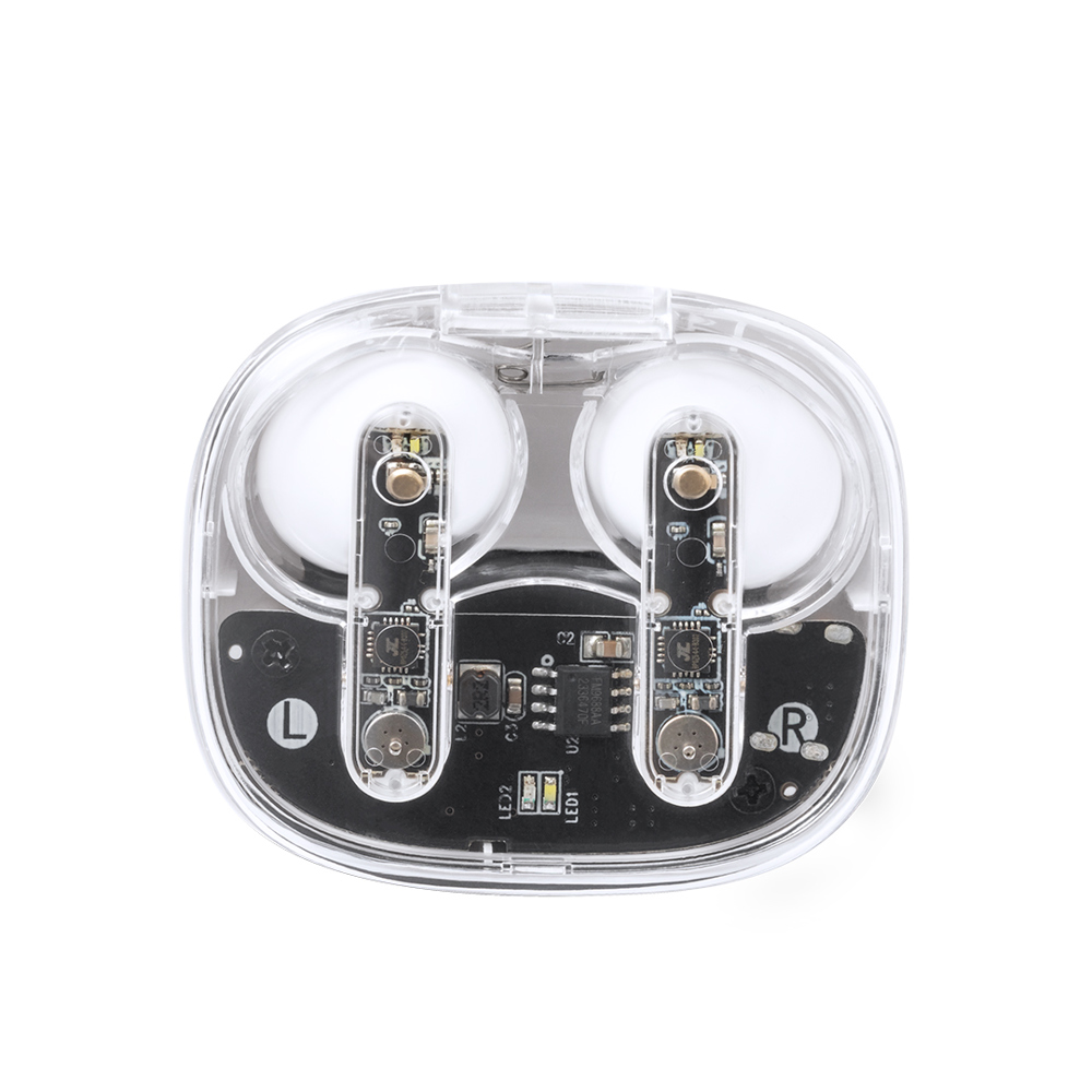 Oortelefoon in opvallend transparant design. Bluetooth® 5.3-verbinding en lange batterijduur. Ergonomisch ontworpen, met geïntegreerde aanraakbedieningsknop op de headset, bijpassende oplaadbasis en oplaadstatusindicatoren. Handsfree functie. Oplaadpoort met Type-C-ingang (kabel meegeleverd). Gepresenteerd in individuele kraft designdoos en gerecyclede zak.