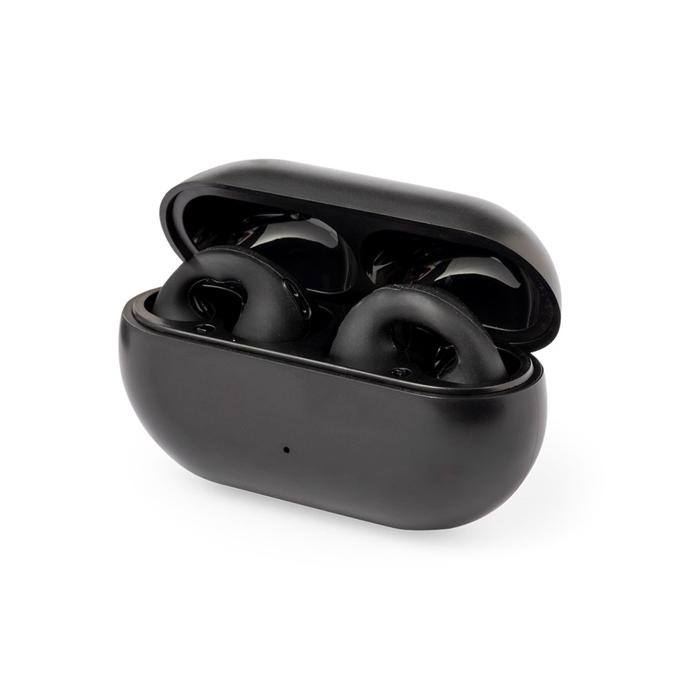 Open-ear hoofdtelefoon met Bluetooth® 5.3-verbinding en handsfree-functie. Ontworpen om perfect in de oren te passen met behulp van een handige clip, wat een comfortabele luisterervaring biedt. Touch control-knop geïntegreerd in het oorstuk, met bijpassend oplaadstation en 200 mAh-batterij, Inclusief type C-aansluiting en oplaadkabel. Gepresenteerd in een individuele kraft-designdoos, met handleiding in het Engels en Spaans.