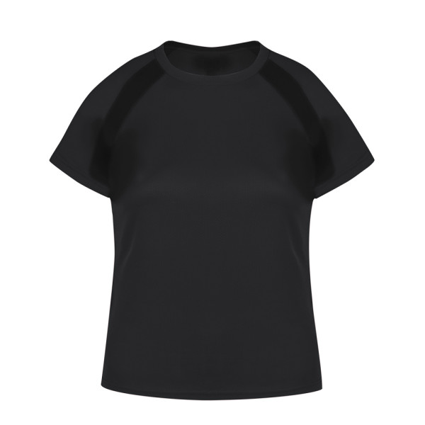 Technisch T-shirt voor dames van 100% polyester, ademend materiaal van 135 g/m2. Met raglanmouwen, ronde hals en met voor- en zijbanden van ademende micro-geperforeerde stof. Verkrijgbaar in de maten S, M, L, XL.