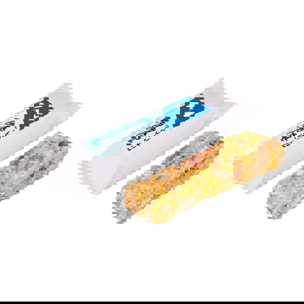 Muesli reep in de smaak appel, voorzien van een full colour sticker op de bovenzijde