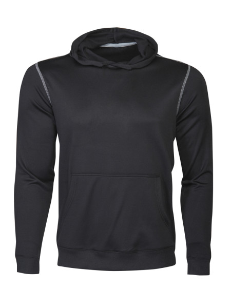Polyester sweatshirt met capuchon. Contrasterende flatlock naden aan de schouders en mouwopening. Binnenzijde is geborsteld voor een zacht en warm gevoel. Ook verkrijgbaar in kindermaten.
