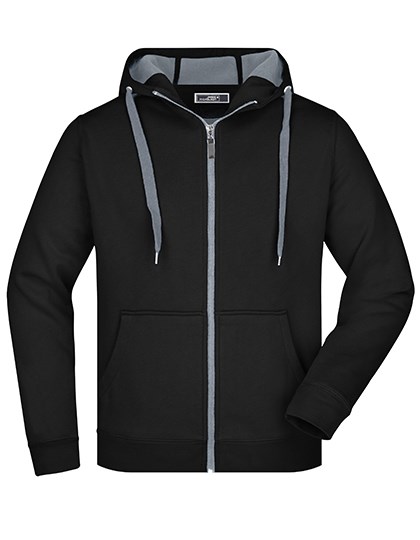 Sportief herenjack met capuchon | Capuchon met kinbescherming | Volledige rits | Koord en binnenkant in contrasterende kleur | Kangoeroezakken | Flatlock naden | Mouw en tailleband met elastaan | Ingezette mouwen