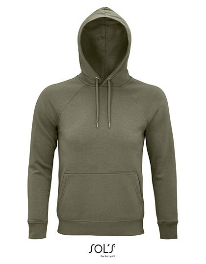 Fleece 280 | 80% biologisch katoen / 20% gerecycleerd polyester | 3 draden | Binnenzijde opgeruwd | Buitenkant: 100% katoen, ribben: 97% biologisch katoen / 3% elastaan | Biohoodie | Zijnaad | Gekruiste hals | Kangoeroezakje | Raglanmouwen | Halve-maanvorm in hals | Katoenen nektape | 2x2 geribde manchetten en zoom | Zilveren oogjes en stoppers | Rond ton-sur-ton trekkoord | Geen etiket