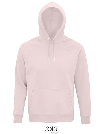 Fleece 280 | 80% biologisch katoen / 20% gerecycleerd polyester | 3 draden | Binnenzijde opgeruwd | Buitenkant: 100% katoen, ribben: 97% biologisch katoen / 3% elastaan | Biohoodie | Zijnaad | Gekruiste hals | Kangoeroezakje | Raglanmouwen | Halve-maanvorm in hals | Katoenen nektape | 2x2 geribde manchetten en zoom | Zilveren oogjes en stoppers | Rond ton-sur-ton trekkoord | Geen etiket