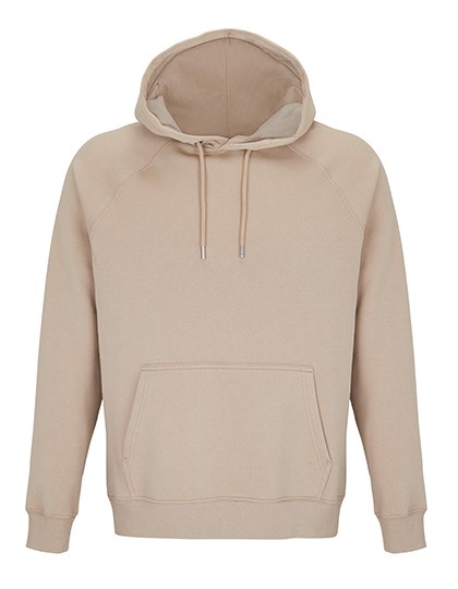 Fleece 280 | 80% biologisch katoen / 20% gerecycleerd polyester | 3 draden | Binnenzijde opgeruwd | Buitenkant: 100% katoen, ribben: 97% biologisch katoen / 3% elastaan | Biohoodie | Zijnaad | Gekruiste hals | Kangoeroezakje | Raglanmouwen | Halve-maanvorm in hals | Katoenen nektape | 2x2 geribde manchetten en zoom | Zilveren oogjes en stoppers | Rond ton-sur-ton trekkoord | Geen etiket