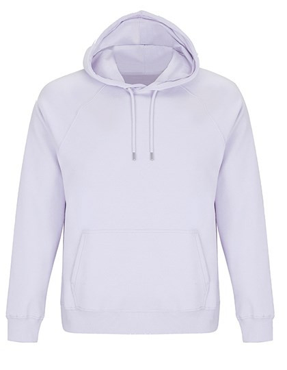 Fleece 280 | 80% biologisch katoen / 20% gerecycleerd polyester | 3 draden | Binnenzijde opgeruwd | Buitenkant: 100% katoen, ribben: 97% biologisch katoen / 3% elastaan | Biohoodie | Zijnaad | Gekruiste hals | Kangoeroezakje | Raglanmouwen | Halve-maanvorm in hals | Katoenen nektape | 2x2 geribde manchetten en zoom | Zilveren oogjes en stoppers | Rond ton-sur-ton trekkoord | Geen etiket