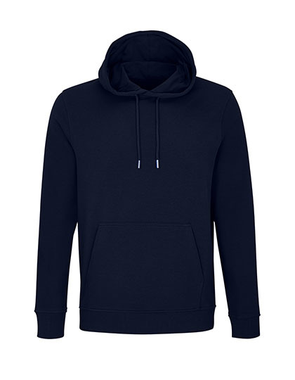 Geborsteld biologisch geconverteerd katoen | Gerecycleerd polyester | Gesneden en genaaid | Ingezette mouwen | 2x2 geribbelde manchetten en onderkant | Kangoeroezakje | Halve maan van jersey en halsboord aan de binnenkant van de kraag | Gevoerde kap van jersey | Trekkoord met metalen oogjes en uiteinden | Niet-geborstelde binnenkant