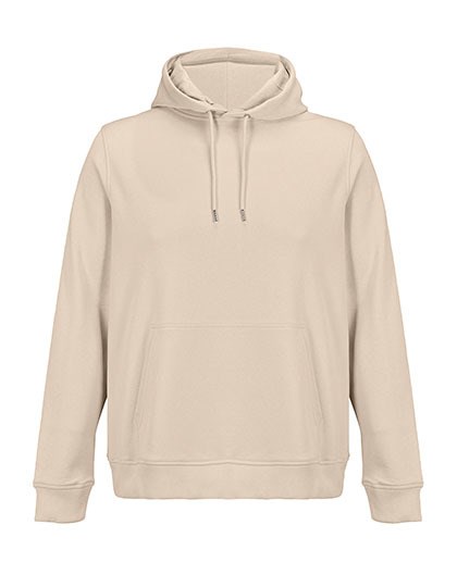 Geborsteld biologisch geconverteerd katoen | Gerecycleerd polyester | Gesneden en genaaid | Ingezette mouwen | 2x2 geribbelde manchetten en onderkant | Kangoeroezakje | Halve maan van jersey en halsboord aan de binnenkant van de kraag | Gevoerde kap van jersey | Trekkoord met metalen oogjes en uiteinden | Niet-geborstelde binnenkant