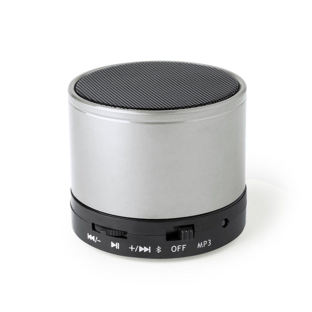 Compacte luidspreker met Bluetooth® 5.0-verbinding EN 3 W vermogen. Handsfree-functie, sleuf voor mini-SD-kaarten met een capaciteit tot 64 GB, FM-radiofunctie en Aux-in via 3,5 mm jack-aansluiting. Met antislip rubberen pads op de basis. Compatibel met iOS en Android, inclusief oplaadkabel en 3,5mm jack AUX-kabel. Geleverd in een aantrekkelijke designdoos, met gebruiksaanwijzing in het Engels en Spaans. Verkrijgbaar in een groot aantal metallic kleuren.